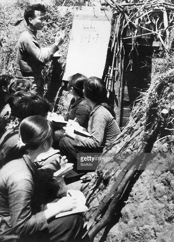 Các nữ chiến sĩ tại một lớp học học toán ngay dưới chiến hào ở Vĩnh Linh, Quảng Trị năm 1960. Ảnh: Sovfoto – GettyImages.