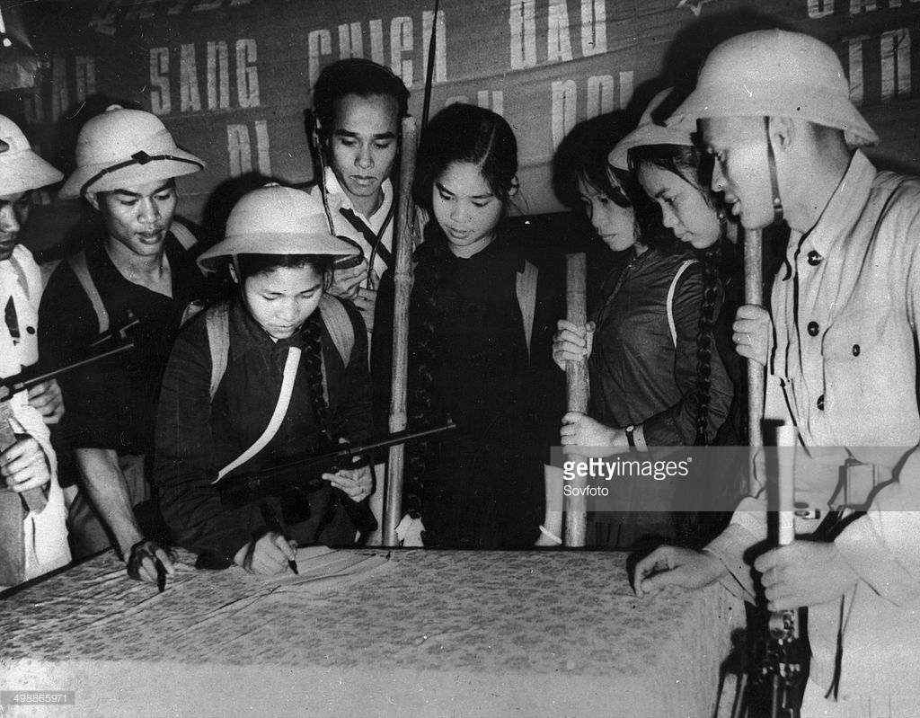 Những người phụ nữ trong đủ mọi vị trí của ĐH Bách Khoa như giáo viên, sinh viên, công nhân viên… ký đơn tham gia phong trào Ba Sẵn Sàng ở Hà Nội năm 1966. Ảnh: Sovfoto – GettyImages.