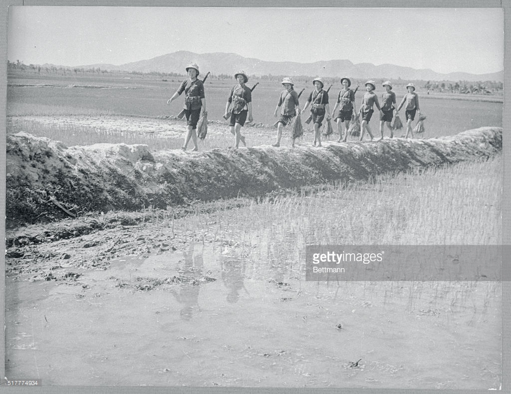Những người nữ dân quân đi làm ruộng với cây súng trên vai, ở Hòa Lộc, Thanh Hóa, tháng 10/1967. Ảnh: Bettman – GettyImages.