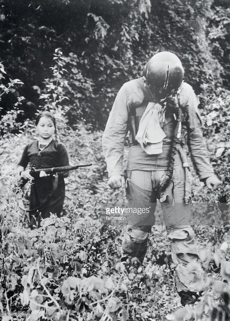 Người nữ dân quân áp giải một phi công Mỹ bị bắn hạ trên bầu trời gần Hà Nội, tháng 9/1967. “Giặc lái” này được xác định danh tính là Thiếu tá Gerald Santo Venanzi. Ảnh: Bettman – GettyImages.