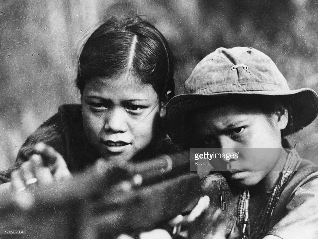 Nữ du kích 14 tuổi hưởng dẫn em gái cách sử dụng súng tại một ngôi làng thuộc vùng Giải phóng ở Thừa Thiên – Huế năm 1968. Ảnh: Sovfoto – GettyImages.