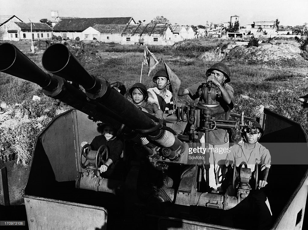 Người nữ chiến sĩ của đội tự vệ nhà máy đóng tàu Bạch Đằng (Hải Phòng) sát cách cùng các đồng đội nam trên mâm pháo bảo vệ nhà máy, năm 1969. Ảnh: Sovfoto – GettyImages.