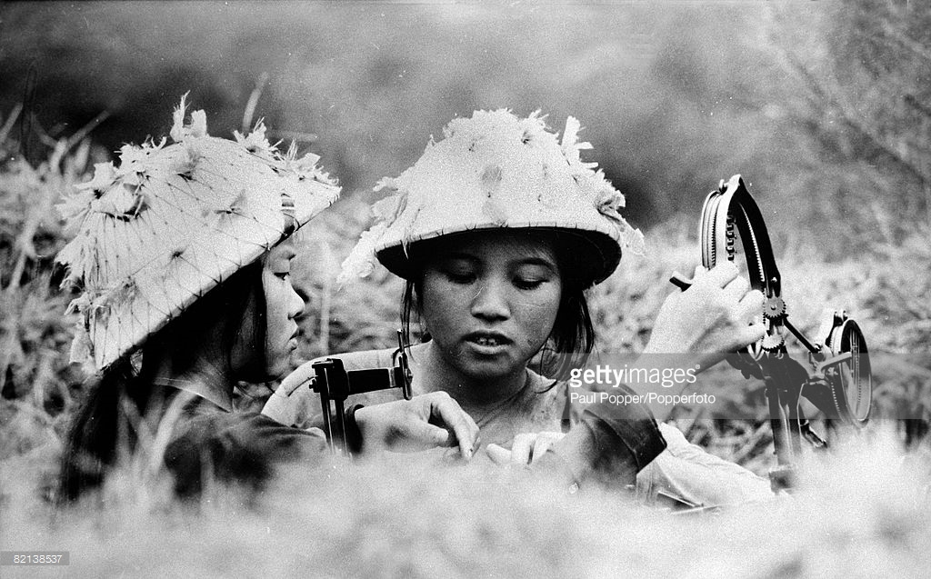 Hai nữ dân quân trực chiến bảo vệ nhà máy của mình trước các cuộc đánh phá của không quân Mỹ, miền Bắc năm 1969. Ảnh: Paul Popper/Popperfoto – GettyImages.