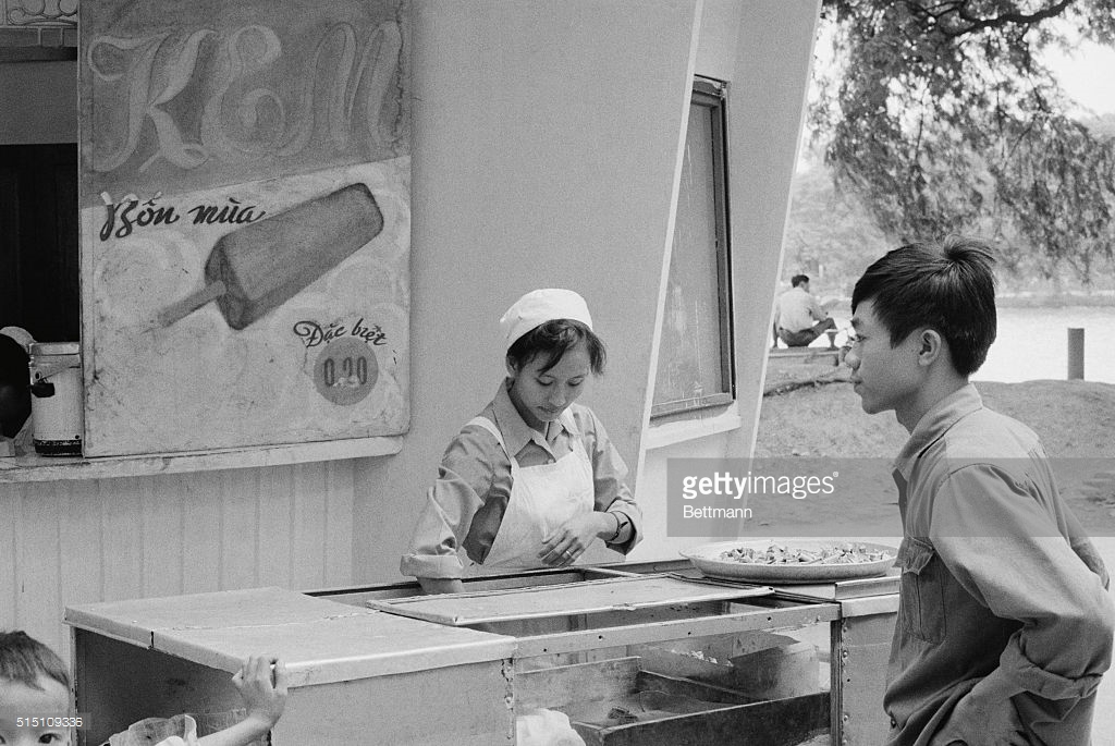 Người nữ nhân viên bán kem cho khách tại hàng kem Bốn Mùa nổi tiếng bên bờ hồ Gươm, Hà Nội tháng 11/1973. Ảnh: Bettman – GettyImages.