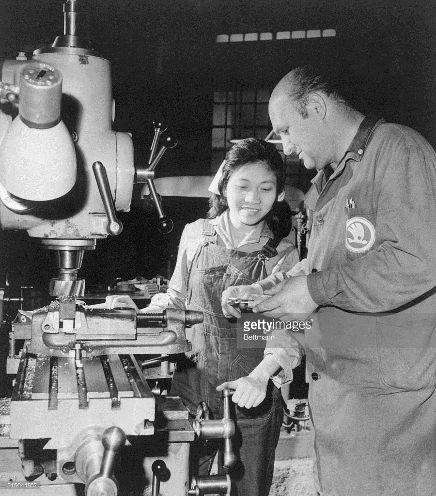 Chuyên gia Tiệp Khắc hưỡng dẫn kỹ thuật cho nữ công nhân Việt Nam tại một trường cơ khí ở Hải Phòng năm 1971. 54 nam nữ thanh niên được chuyên gia Đông Âu đào tạo ở đây trong khóa học 3 năm. Ảnh: Bettman – GettyImages.