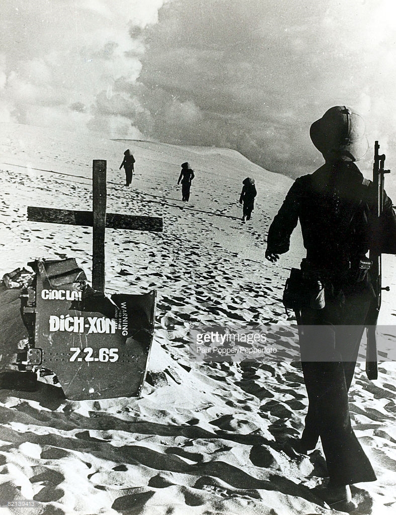 Quảng Bình năm 1970, một nhóm nữ dân quân bước qua “nấm mộ” làm bằng mảnh xác máy bay của một “giặc lái” Mỹ tên Dickson bị bắn rơi tại đây ngày 7/2/1965. Ảnh: Paul Popper/Popperfoto – GettyImages.