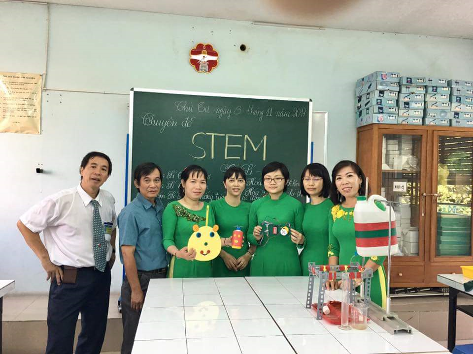 Các thầy cô dạy môn Vật Lý đang hướng dẫn các em học sinh làm các sản phẩm ứng dụng trong tiết học