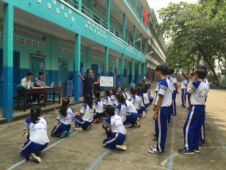 Thầy Kim Hân hướng dẫn các em học sinh trong tiết dự thi của mình và có Ban giám khảo chấm điểm